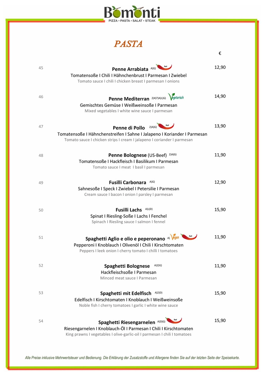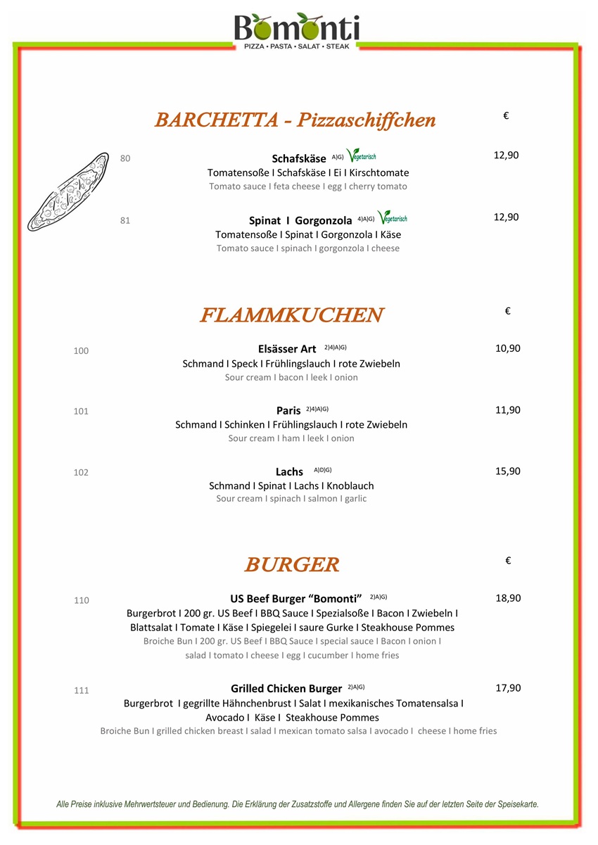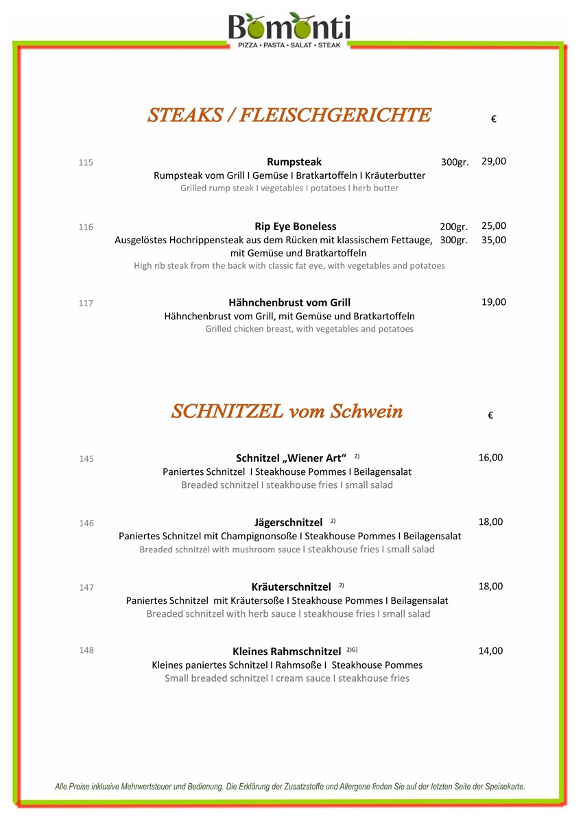 Alle Preise inklusive Mehrwertsteuer und Bedienung. Alle Angaben ohne Gewähr. Irrtümer vorbehalten.